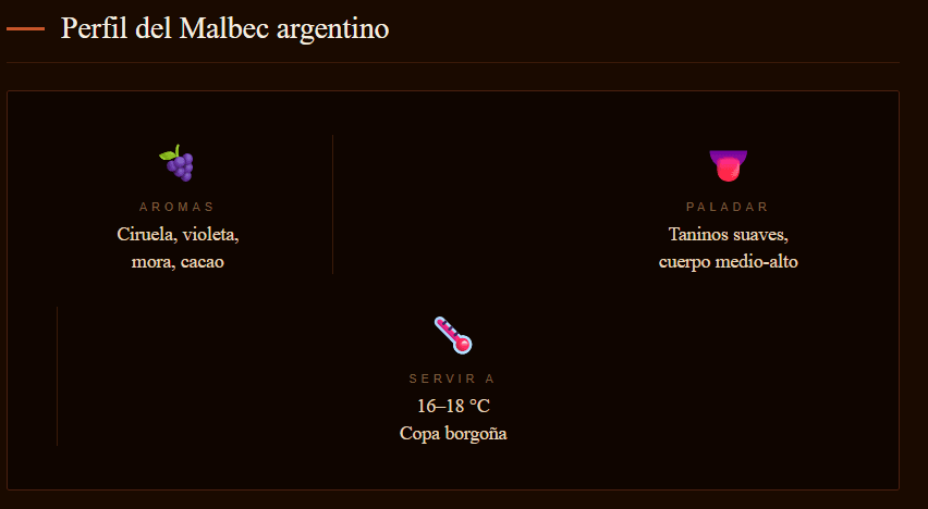 El Malbec argentino —especialmente el de Mendoza y Valle de Uco— tiene notas de ciruela, mora y violeta, con un fondo de cacao y especias suaves. Su cuerpo es medio-alto, sus taninos son sedosos y su acidez es equilibrada. Eso lo hace suficientemente estructurado para acompañar carnes, pero lo bastante frutal para no aplastar sabores más delicados.